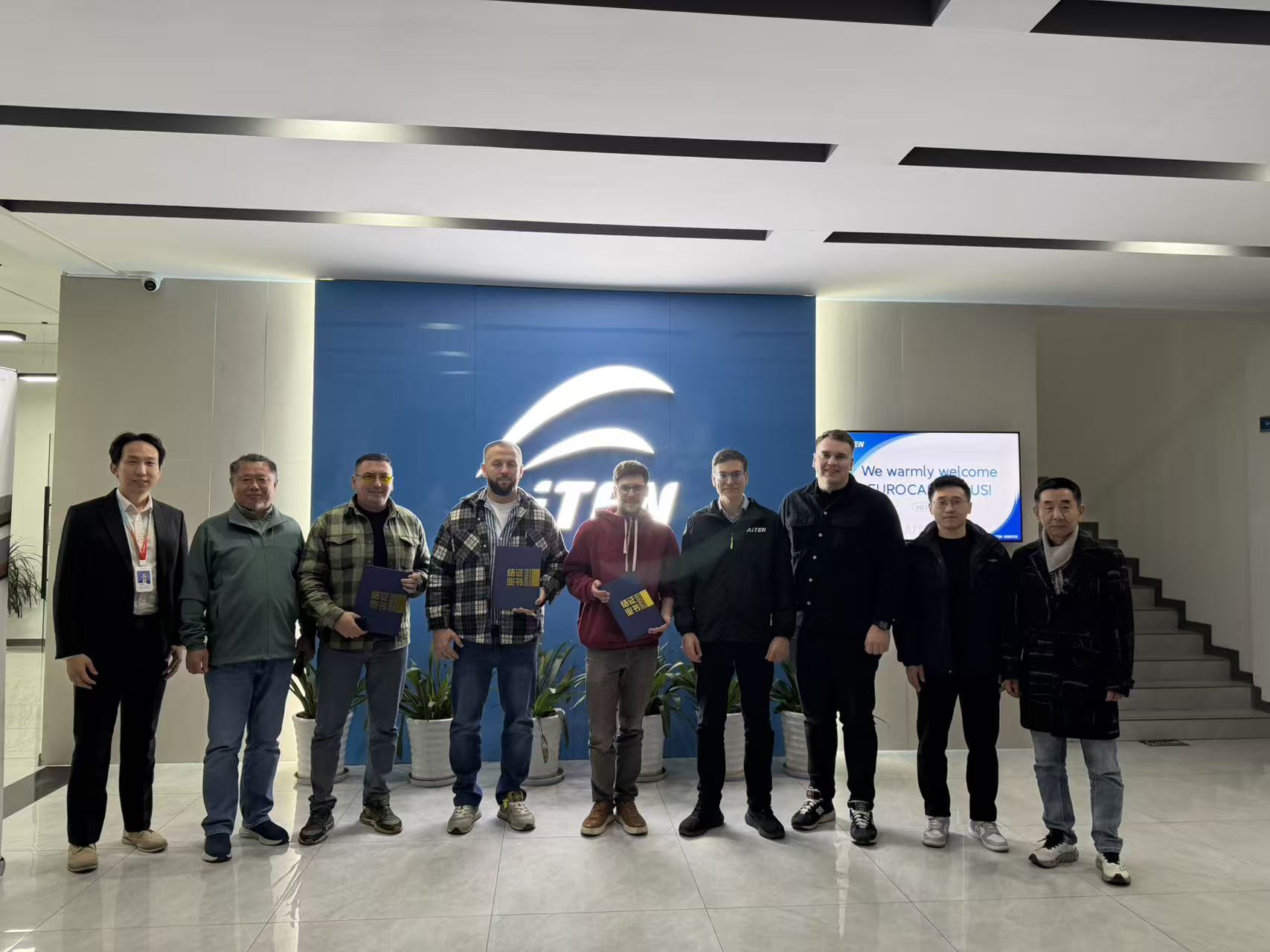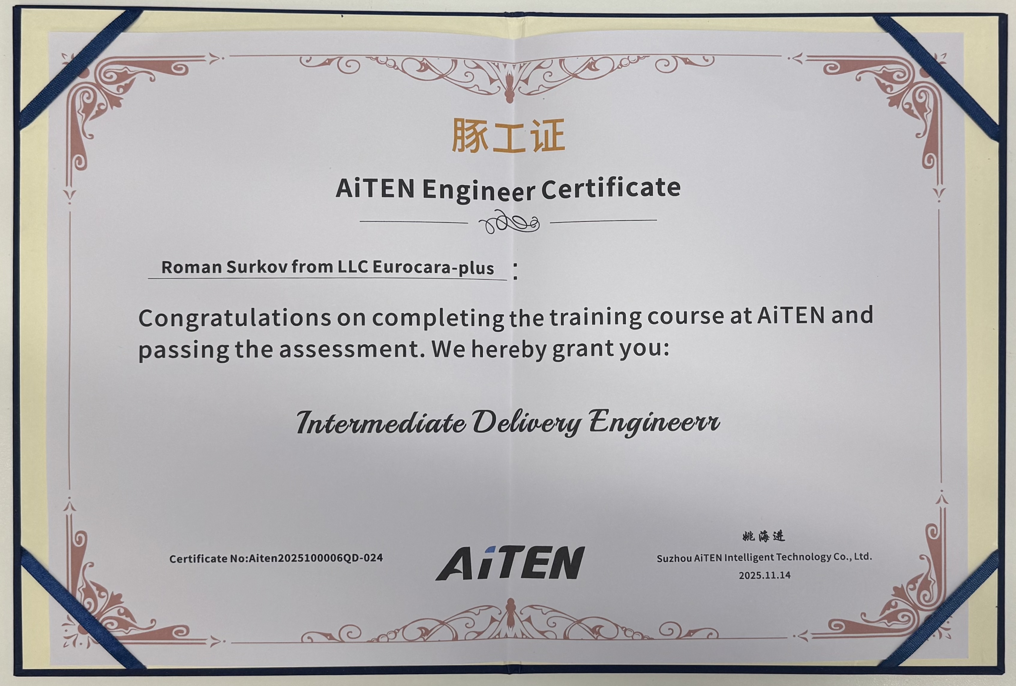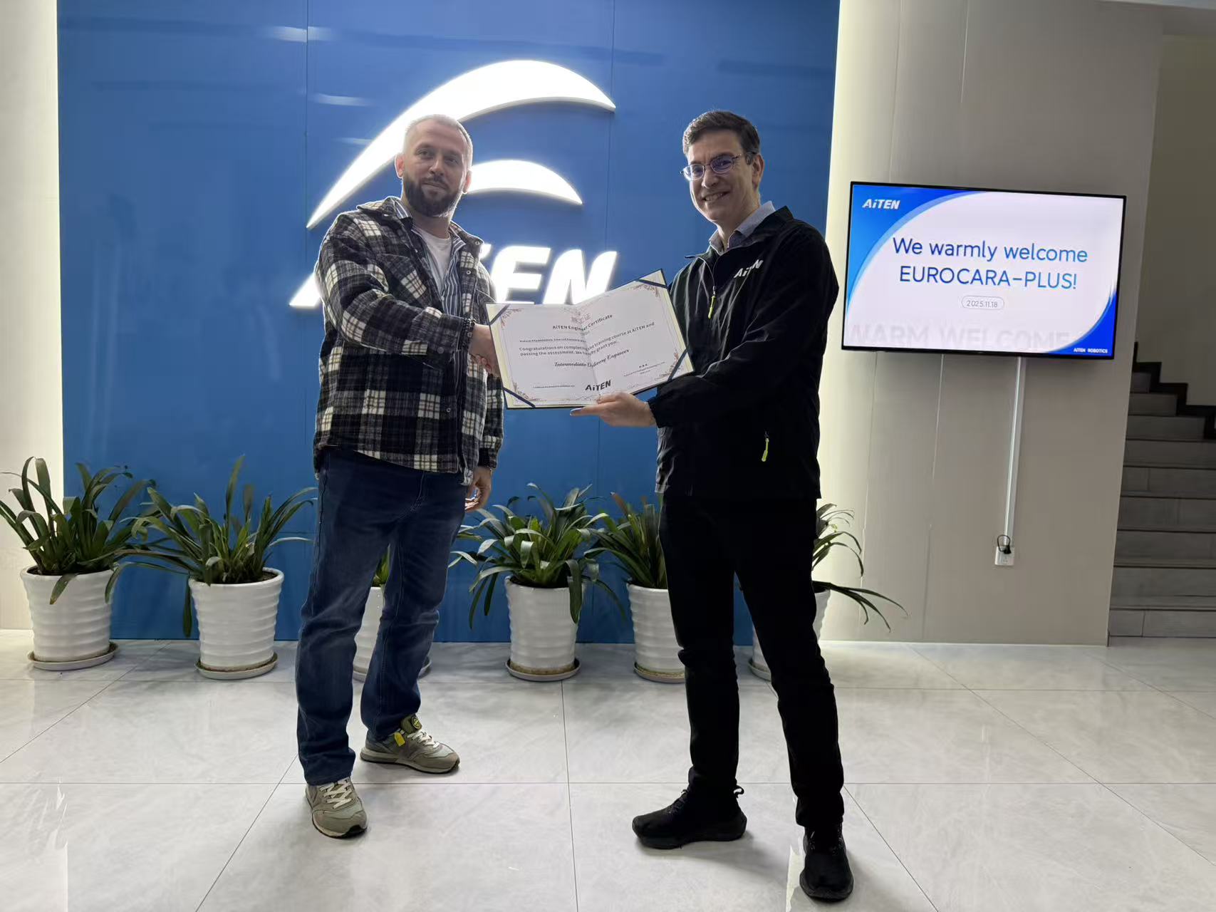 Особое место в программе заняло посещение Suzhou AiTEN Intelligent Technology Co., Ltd. (AiTEN Robotics) — компании, специализирующейся на разработке интеллектуальных робототехнических решений. IT‑специалисты «Еврокара‑плюс» прошли обучение и аттестацию, получив официальный Инженерный сертификат (Intermediate Delivery Engineer), подтверждающий их компетенции в работе с решениями AiTEN.